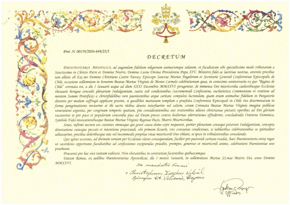 El documento otorgado bajo la autoridad del Papa León XIV, faculta a la Conferencia Episcopal de Chile, a través del Secretario General, Obispo Cristian Castro Toovey - o a otro prelado investido de dignidad episcopal con su consentimiento- el impartir la Bendición Papal con la respectiva indulgencia con ocasión de las solemnes celebraciones en honor de la Bienaventurada Virgen María del Monte Carmelo.