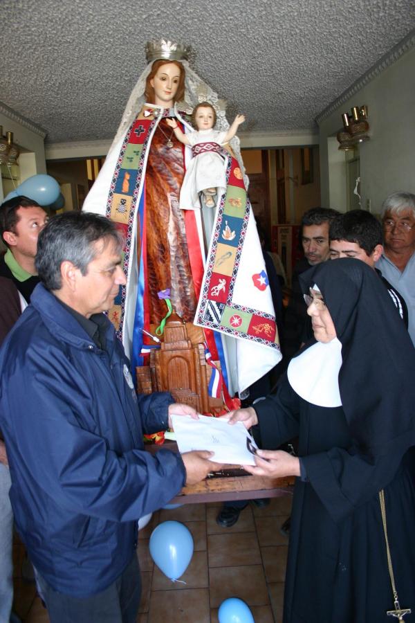 En el marco de la visita de la imagen de la Virgen del Carmen Misionera, las religiosas del Hogar de Ancianos Nuestra Señora del Carmen, enviaron a través de chofer Raúl Veroisa un sobre el que contiene 33 estampitas con el mensaje “Gracias Madre: Soy tu hijo minero, tú estás siempre conmigo”, junto a 33 medallitas de Santa Teresa Jornet, para que los proteja y los aliente en su espera mientras los rescatan. El sobre fue entregado al final de la visita de la imagen al Hogar que ellas mantienen en Antofagasta.