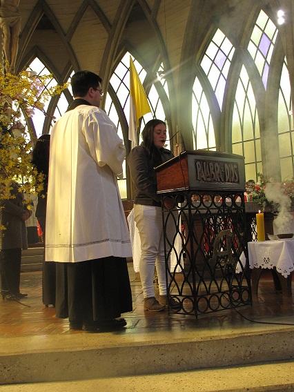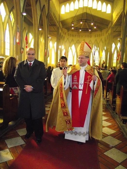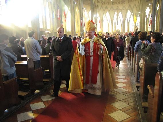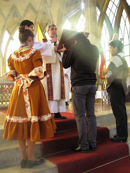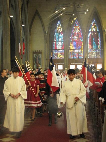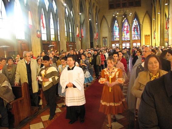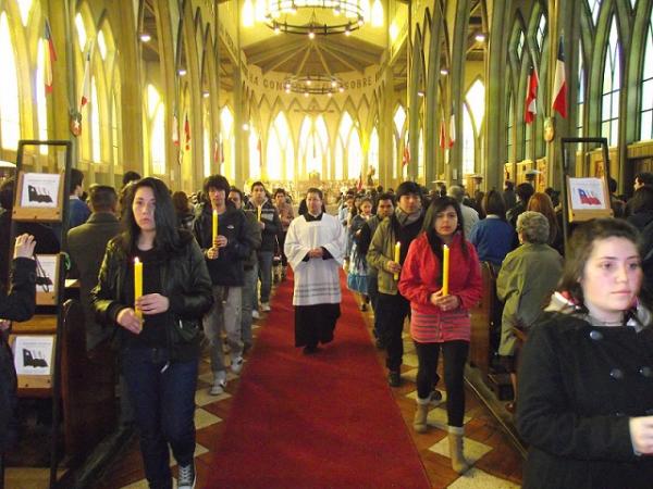 La celebración se inició con la entrada simultánea de tres procesiones, dos por ambos costados del templo Catedral: una compuesta por jóvenes portando las banderas de la Misión Joven y la otra por campesinos con banderas chilenas, mientras que la tercera, conformada por personal consagrado y encabezada por el señor Obispo.