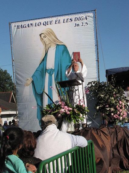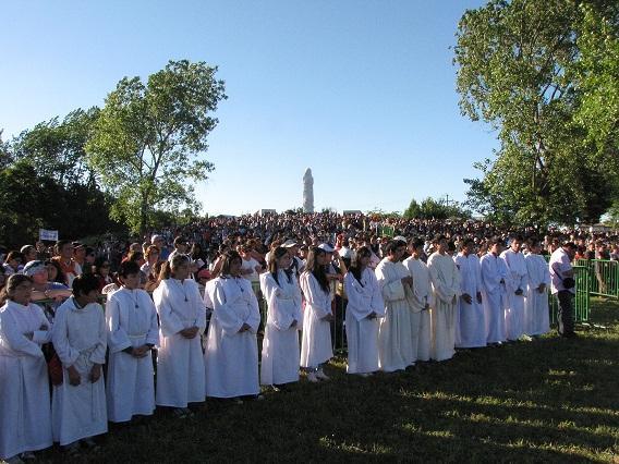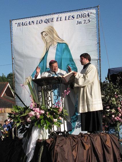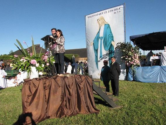 A continuación, Monseñor René expresó el emotivo y profundo saludo que la comunidad eclesial diocesana presenta a la Madre del Señor, un mensaje en el que destacó el rol de los jóvenes en la Nueva Evangelización a la que nos ha llamado el Santo Padre Benedicto XVI: “Virgen, Madre de la Esperanza. Te saludan los jóvenes de la diócesis. Tú eres para ellos aliento, consuelo y fortaleza en el camino de sus vidas. Ellos te invocan como “Madre de la Esperanza” y te suplican tu compañía en la Misión Joven que han emprendido con gozo, pasión e ilusión. Anhelan ser discípulos misioneros de la fe entre sus pares, amigos, compañeros de ruta y de estudios, hermanos en las comunidades juveniles de la diócesis. Ellos quieren estar cerca de los jóvenes que sufren a causa de la desunión familiar, la falta de oportunidades, el flagelo de la droga u otros vicios. Los jóvenes, al saludarte, te contemplan como refugio seguro, motivo de consuelo, gran aliciente y estímulo para proseguir la marcha de la vida”.