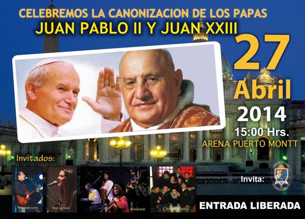 Un gran evento artístico espiritual tendrá lugar en Puerto Montt el domingo 27 de abril, con motivo de la canonización de los Papas Juan Pablo II y Juan XXIII. Además en la oportunidad se dará gracias a Dios por cumplirse 75 años de la creación de la Diócesis de Puerto Montt y será la oportunidad para dar inicio a la segunda etapa del Sínodo Arquidiocesano.