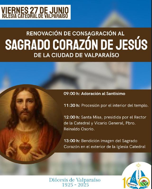 En el marco del Centenario de la Diócesis de Valparaíso, el viernes 27 de junio se celebrará una significativa jornada de fe y tradición en la Catedral porteña. A las 12:00 horas se llevará a cabo una solemne Eucaristía, en la que se renovará la consagración de la ciudad de Valparaíso al Sagrado Corazón de Jesús, acto que recuerda un importante acontecimiento espiritual vivido hace más de un siglo.