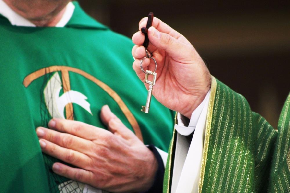 Después de la homilía ambos sacerdotes renovaron sus promesas de ordenación, y luego recibieron del obispo la fuente bautismal, el altar, y al final de la misa, los libros parroquiales y las llaves del Sagrario.