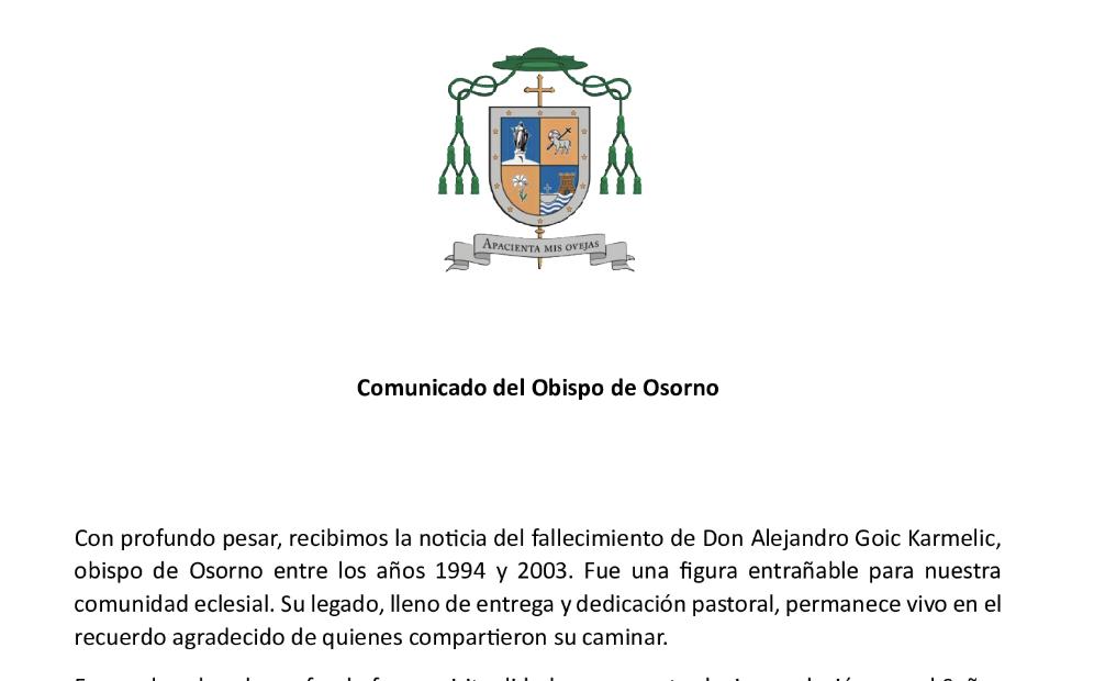 La Diócesis de Osorno agradece su vida, servicio episcopal y testimonio de pastor cercano que supo acompañar a la Iglesia con esperanza y fraternidad.