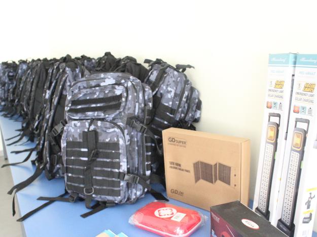 La mochila contiene un panel solar portátil, radio solar con linterna, lámparas LED portátiles y ajustables, y un botiquín de primeros auxilios.