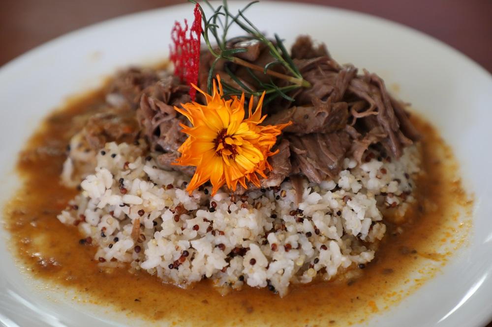 “Esta preparación tiene un sentido muy bonito. La entrada fue una ensalada surtida con aderezo de finas hierbas y miel; el plato de fondo, un arroz salvaje con carne de res braseada con hierbas; y el postre, una sémola con leche con salsa de vino tinto y berries del bosque”, detalló.