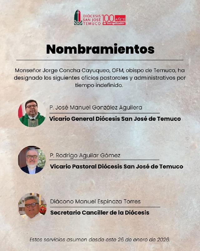 Con espíritu de comunión y servicio, la Diócesis San José de Temuco informa los recientes decretos emitidos por nuestro Obispo Diocesano, mediante los cuales se disponen nuevos nombramientos.