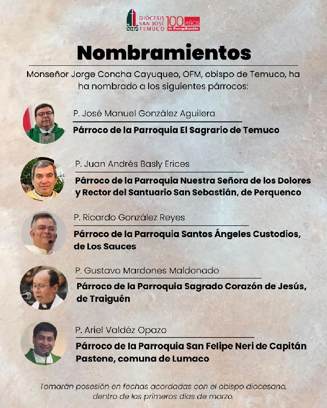 Nombramiento de Vicario General, Vicario Pastoral, Canciller y Párrocos de la Diócesis San José de Temuco