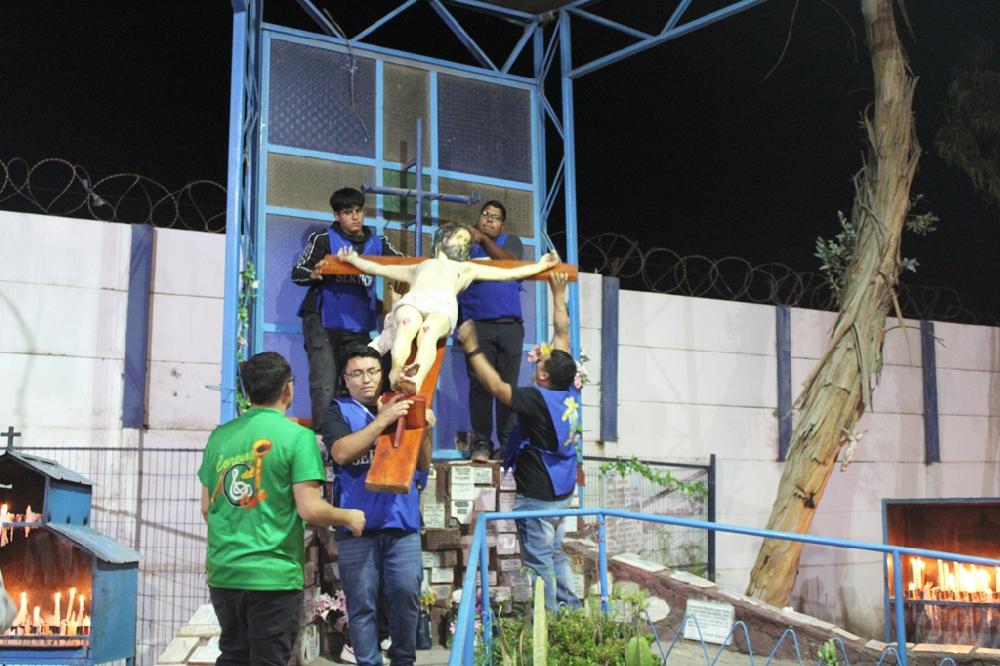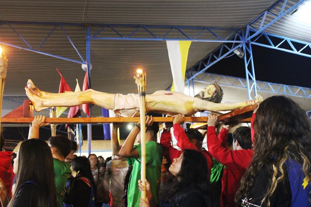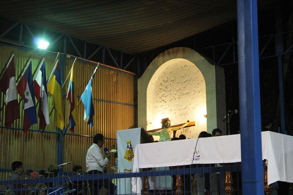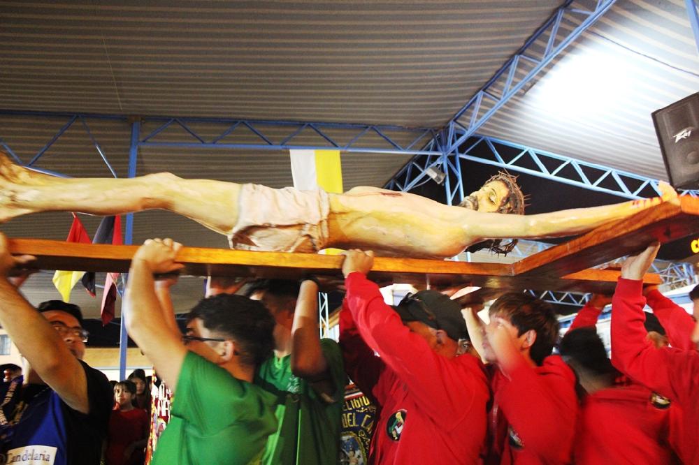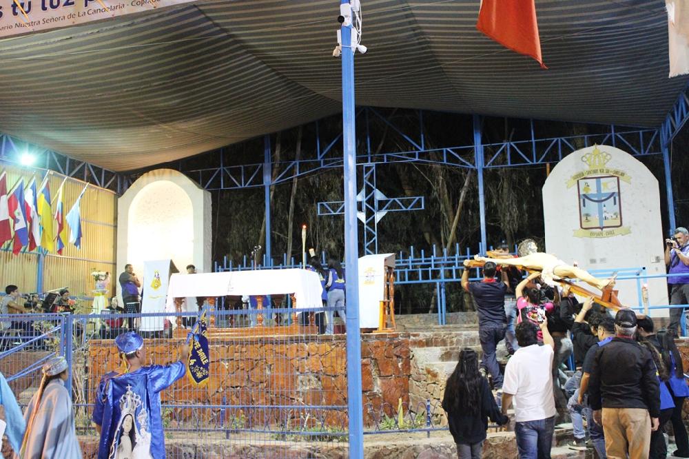 Después de la misa tuvo lugar la procesión que traslada la imagen del Cristo Crucificado desde un costado del patio, que s su lugar habitual, hasta la pared posterior del altar, donde permanecerá hasta el último día de fiesta, lunes 9 de febrero. La procesión tuvo cuatro estaciones de oración, y fue acompañada de bailes religiosos.